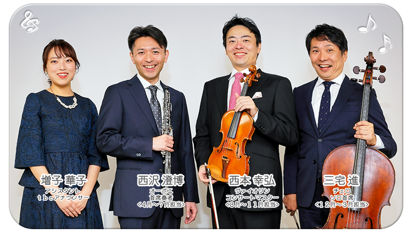 仙台フィルハーモニー管弦楽団の西本幸弘(ヴァイオリン/コンサートマスター)、三宅進(チェロ)、西沢澄博(オーボエ)の3人が月替わりでパーソナリティを務めます。様々な切り口からクラシック音楽の楽しみ方をナビゲート!