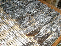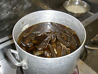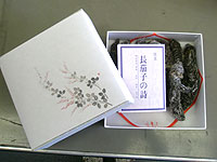 仙台長なすといえば漬物!ですが、お菓子=砂糖漬けがあるんです。九十三庵喜久知の「長茄子の詩」は、仙台長ナスを砂糖水に漬け、甘納豆風に砂糖をまぶしたお菓子です。仙台が誇る秋野菜といえば長なす、これで銘菓を作りたい!とこのお菓子のためだけに長ナスを育てる若林区七郷の農家と契約を結び、6月から長ナスが収穫できるまで(だいたい11月)限定販売しています。 長茄子の詩を見たお客さんは、これなーに?本当にナスを使っているの?もしや漬物?と色々な疑問を抱くようで、もちろん私もその一人。煮込むため、色は茄子独特の青から黒っぽくはなるものの、形はだいたい保たれています、ヘタもついたままですし。そこで一口頂いてみたところ…。ナスのねっとりした食感でこのまま甘さが続くのかと思いきや、タイミングを見計らっているかのように甘さがすっと引いていく感じがしました。この甘さの加減を追求するのに時間がかかったそうです。これ以上甘くすると砂糖が固まるし、甘くしないようにすると日持ちがしなくなるなど、試行錯誤の末に完成したお菓子なのです。ナスのふっくら感を出そうとするとシナシナになるし、師匠にも助言をもらいながら作られたそうです。今はこれで満足!という菊地さん。本番後も問い合わせの対応に追われていました。多くの方が興味を持たれたようです。何ていったって仙台長ナスのお菓子ですもの。緑茶にもぴったり。このシーズンならではの味をご賞味下さい。 (高橋亜由美)