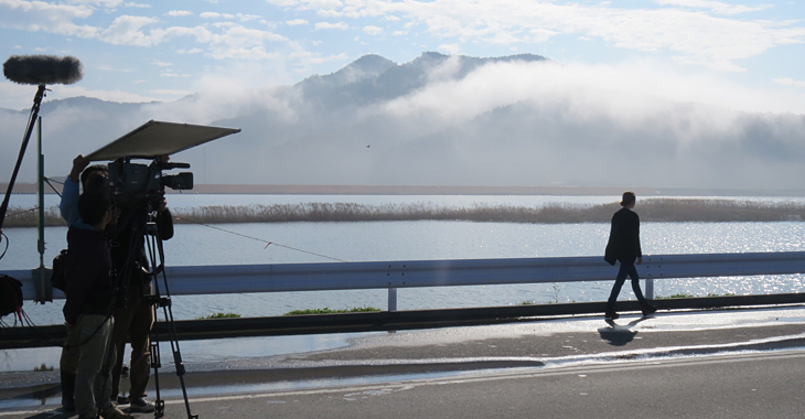 滔々と流れる北上川。ロケ開始の直前まで立ち込めていた霧は一気に晴れ渡り、ここが被災地であることを忘れてしまうような静寂さと幻想的な雰囲気に包まれた。