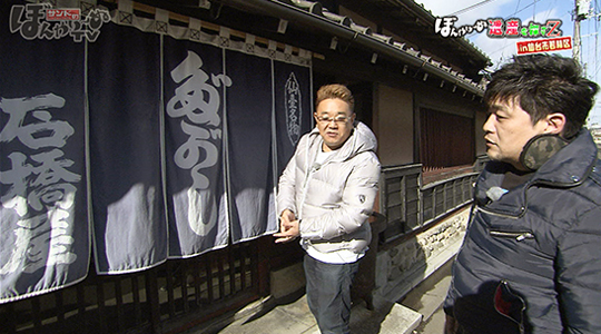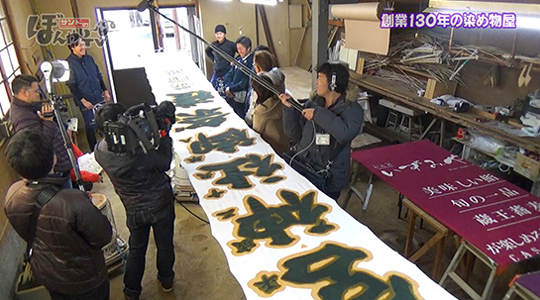 南染師町に伝わる、染物を手掛ける創業130年の染め工場。法被や手拭いなど、商品のひとつひとつに職人の技が光っています。工場の今後の新たな構想のひとつは「ふんどし」!?今回特別に、サンドの2人もふんどしデザインを考案!