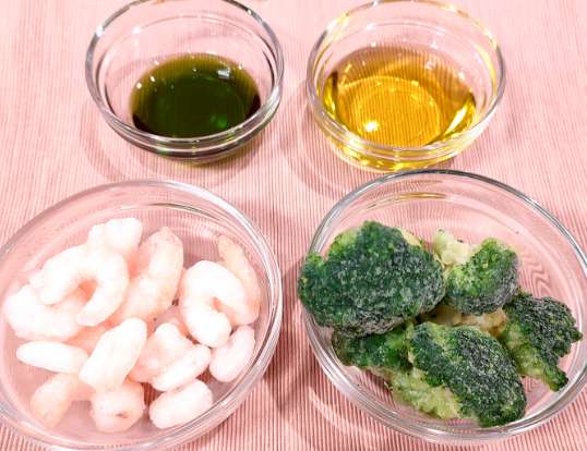 • 冷凍ブロッコリー、むきエビを袋の表示通りに解凍し、少量のオリーブオイル(分量外)と一緒に水分を飛ばすようにフライパンで温めます。そこにオリーブオイルとバジルソースも加えて(お好みでニンニクも)、アツアツになるまで加熱すれば完成!