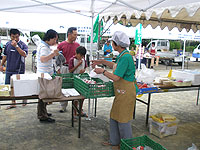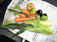 第8回北赤井地区やさいまつり。午前7時のスタートを待ちきれず、3時半に目覚めたおばあちゃんは5時には会場に到着。今か今かと待ちわびて、袋いっぱいに野菜を詰め込んで帰られたそうです。15出店、わずか1時間で1,000人ものお客さんがいらっしゃって、赤井在住の主婦の方から「遅いよ!あゆみちゃん。まだラジオカー来ないうちにお客さんも売る品物も ほとんど有りませんよ!」とメールを頂いたくらいです…。 赤井地区の野菜はおいしいのはもちろんのこと、安いので家計が助かります。トマト3コで100円、ネギは7〜8本で1束100円など、毎日使う新鮮野菜がびっくりするほど安価。東松島産のトウモロコシ、ミライとゴールドラッシュは今が食べ頃。香りも味も甘くていうことなし!阿部さんが今朝4時に収穫した朝採りですから格別です。中区ボランティアさくらんぼ会の渥美さんは、このまつりのために昨日夕方に長なすを漬けました。お盆中も直売所に出荷するので、自宅のお盆準備との両立で大忙しです。また、子ども達も奮闘!花奈ちゃん(小4)と翔大くん(小2)が栗駒山でお父さんとおじさんと捕まえたミヤマクワガタ、自宅前にバナナを置いて集めたノコギリクワガタも完売。「カブトムシいかがですか〜?子どものプレゼントにいかがですか〜?」という翔大くんのセールストークがいいからかな? 赤井地区の皆さんのお盆準備は順調。皆さんのお宅はいかがですか? (高橋亜由美)