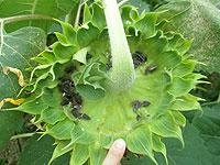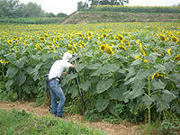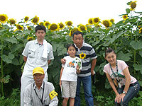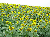 あいにくの曇り空。6ヘクタールの丘に咲き乱れるひまわり達は、どこを向いていいのかわからない様子。それでも、一本一本が存在感があるので集結すると向かうところ敵なしという様子です。今月17日(日)まで開催しているひまわりまつり。今朝も8時前から、札幌や名古屋などの県外ナンバーの車が丘を行き交い、三脚を立てて写真を撮る人も…。泉区加茂の石垣さんファミリーも、今日一日だけのお父さんの休みを利用し、早朝に古川でお墓参りを済ませ、ひまわりの丘に立ち寄りました。春佳ちゃんは「ひまわりにおもしろい顔が描いてあって、楽しい!」と満足そう。この後は、崖の上のポニョを観に行きます。 ひまわりの丘の栽培管理の中心は転作組合の皆さんです。中でも早坂さんは、種蒔き前にたった一人でトラクターで耕し、5月25日の種蒔き後もきれいに花を咲かせるため、6月中旬に二度培土しました。作業中思うことはいつも同じ、「きれいな花を咲かせよう」。だから、きれいですね、すごいですね、という言葉は一番心に染みます。今年は従来のアメリカ産の種をオーストラリア産に替えたためか、形や色はさほど変わらずとも、長く美しさを保っているような感じがすると。また、今の刈り取り時期になると、種の味を占めたスズメやハト、ムクドリやカラスが、首の垂れたひまわりをテーブル代わりに種をついばみます。3分の一は鳥害ですが、鳥にも栄養を与えないと!という早坂さん。こんなふうに温かい気持が、元気な花を咲かせるのかもしれません。 (高橋亜由美)