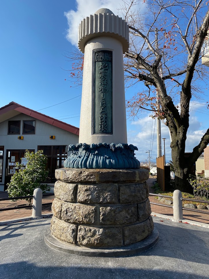 館鼻公園内にある「海嘯災記念碑」。「地震 海鳴り ほら津波」と災害への意識を常に促す。