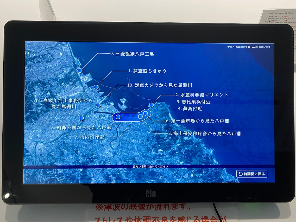 八戸市みなと体験学習館は、入ってすぐに四方八方に当時の映像が映し出される震災タイムトンネルがあり、音と映像で当時の様子を知ることができます。そこをくぐると市民が撮影した当時のアーカイブ映像、さらには今後の備えとして重要な防災グッズなどの展示があり、当時の記憶を忘れないだけでなく、防災への意識の重要性を再認識できる構造になっています。