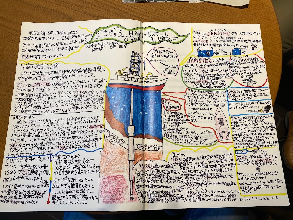 震災発生時「探査船ちきゅう」を見学していた当時小学5年生だった吉田さんが書いたリポートには、津波を避けるため400m沖に出たことなど書かれている。