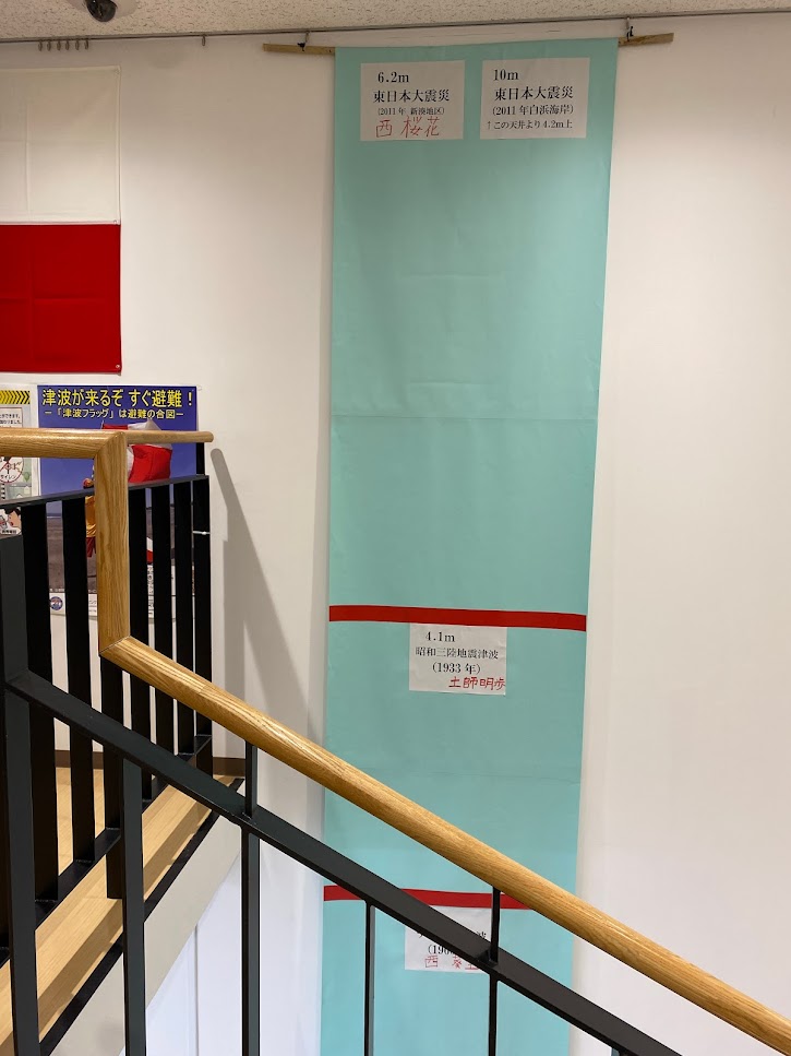 みなと体験学習館では、津波の高さが体感できるように建物の階段部分に表示を付けている。