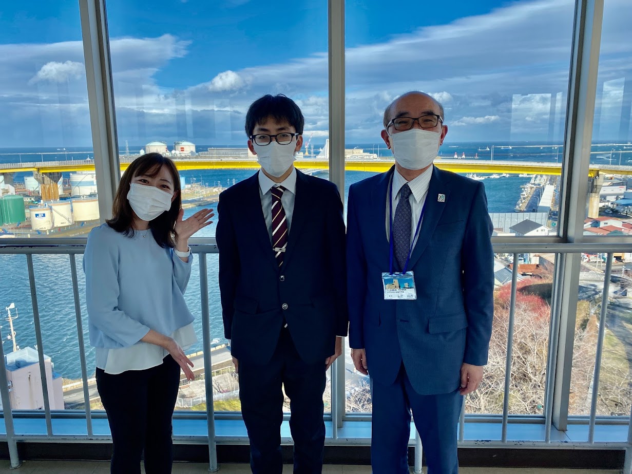 左から八戸市みなと体験学習館の前澤時廣館長、八戸工業大学4年吉田龍平さん、ナビゲーターの伊藤永夏アナウンサー。