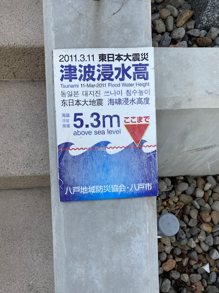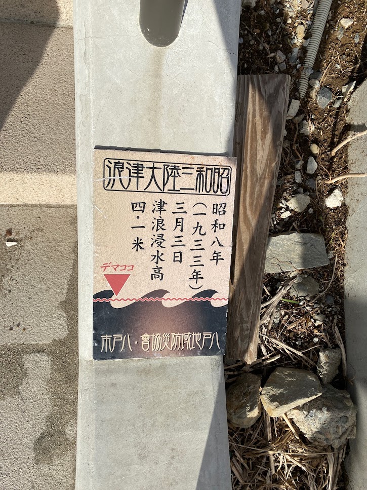 蕪島では「東日本大震災」と「昭和三陸大津波」それぞれの浸水高が示されている。
