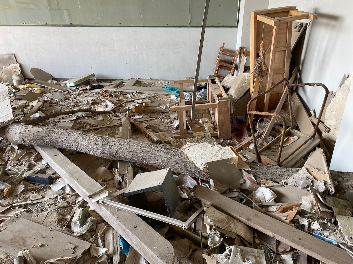 津波は体育館の屋根も壁も破壊した。隣は合宿棟で、かつては生徒たちが楽しく食事をする活気あふれた光景があった。