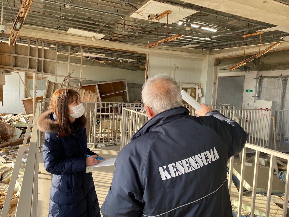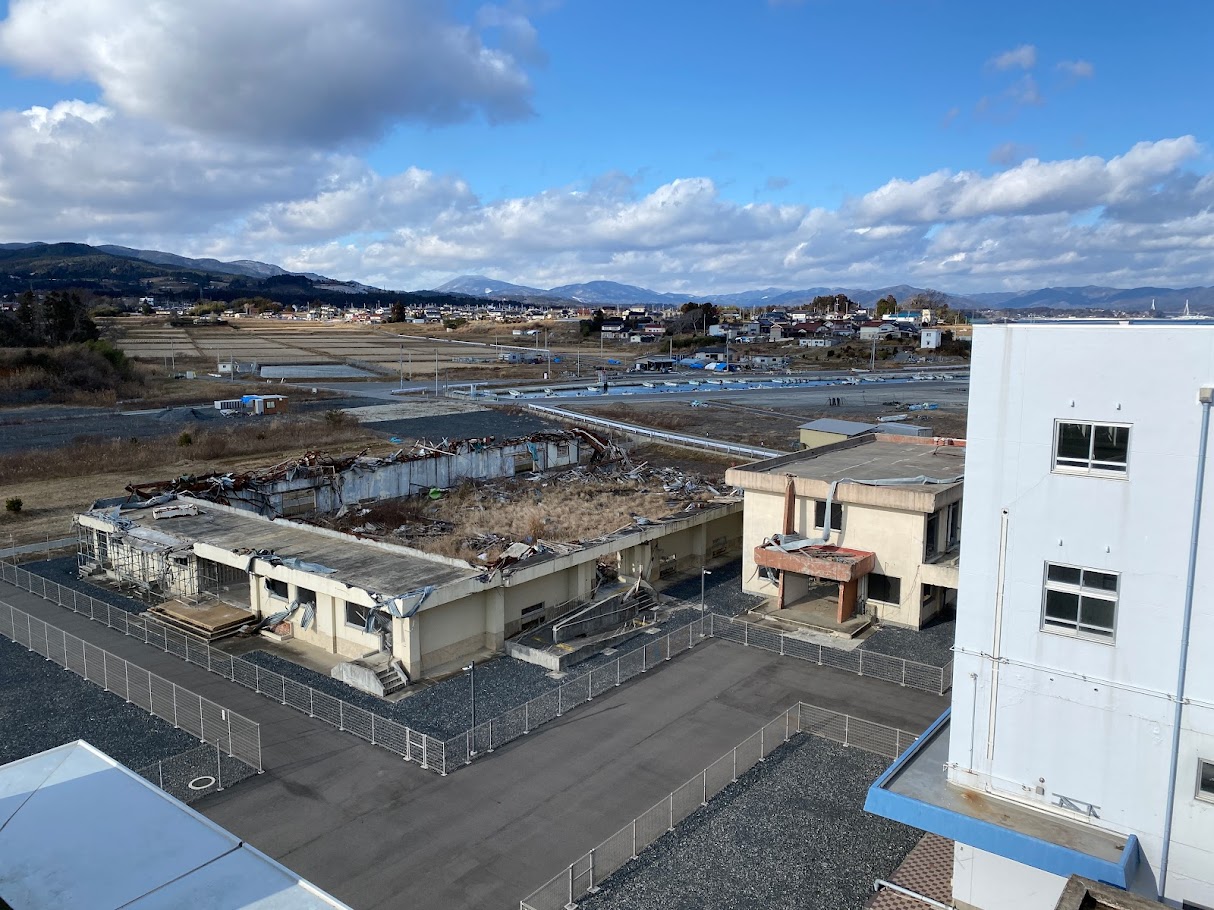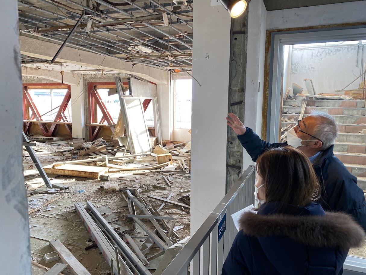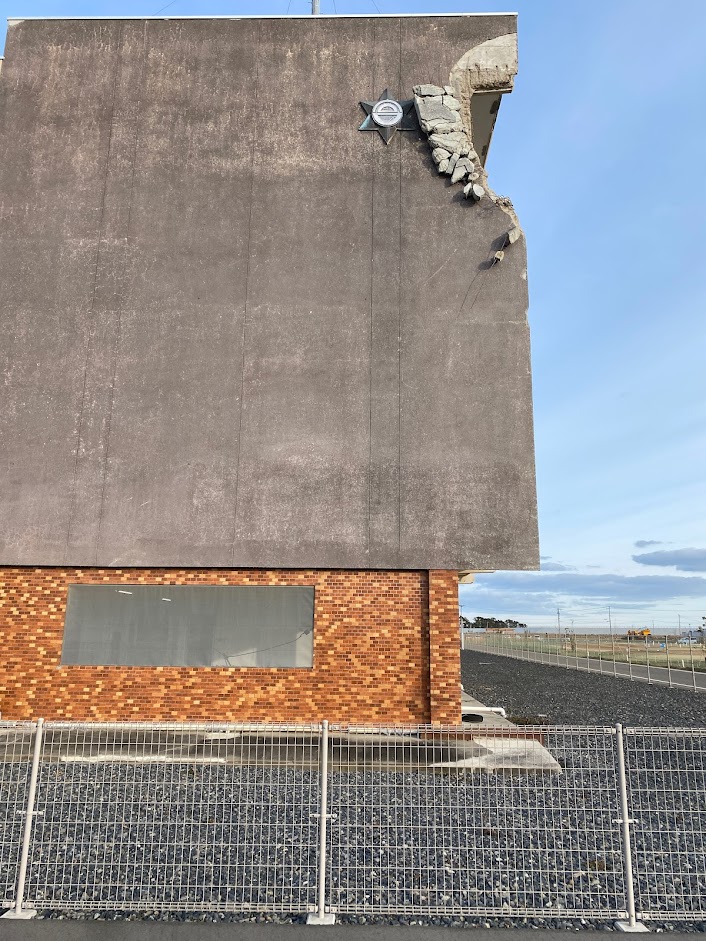 今回初めて足を運んだ私が、車で到着し一番初めに目に飛び込んできたのは、遺構として残されている気仙沼向洋高校の旧南校舎にあたる4階部分の窪みです。最初は揺れによって崩れたのかなと思いましたが、館長に案内してもらうと当時近郊にあった冷凍工場がぶつかり壊れたのだと知り、大きな建物が4階部分まで浮かび流されてくるという想像を絶する津波の恐ろしさに言葉を失いました。