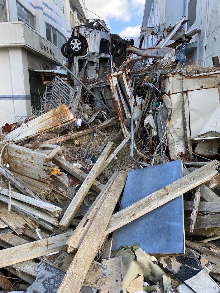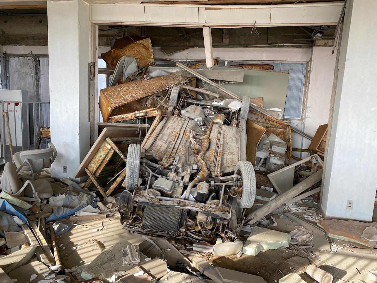 遺構の中に突っ込んできた車があるのは南校舎の3階。そのほかにも冷凍工場の断熱材なども見られ、ありえないものが流れてきたことがわかる。