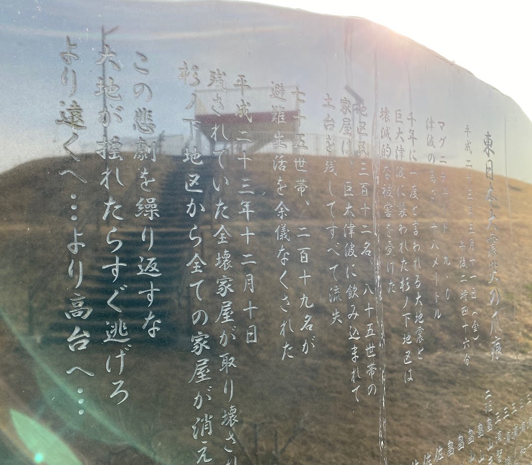 「この悲劇を繰り返すな 大地が揺れたらすぐ逃げろ より遠くへ…より高台へ…」遺族会・小野寺さんがこだわって入れた3行だという。