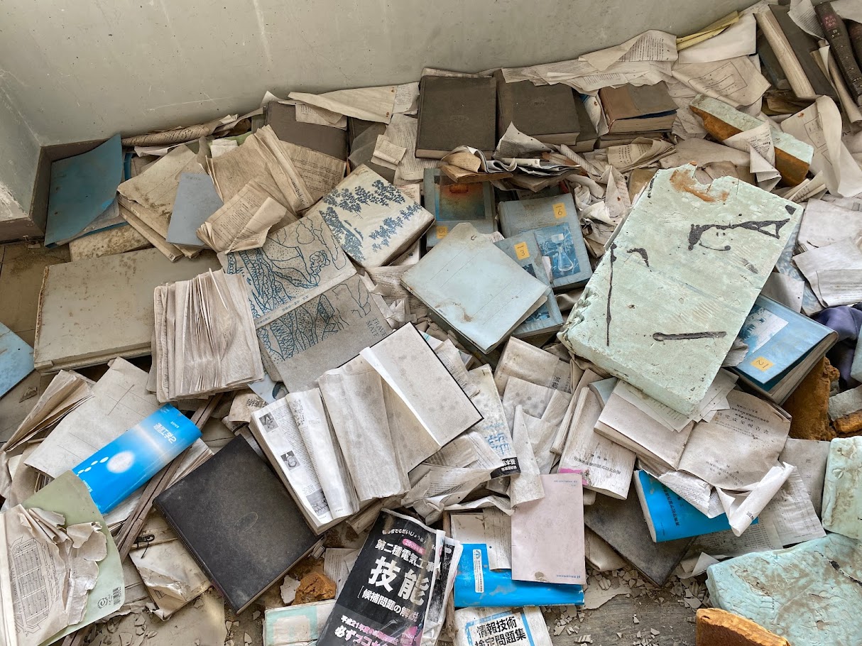 1階は天井がほぼなくなり、骨組みのようなものがむき出しに。2階にあった図書室から流されて3階に入り込んだ書籍の数々には泥が乾いた跡が。また、3階にはひっくり返りほぼ潰れた状態の車があり、地上8メートルの高さまで流れ込んできたという現実を突きつけられました。