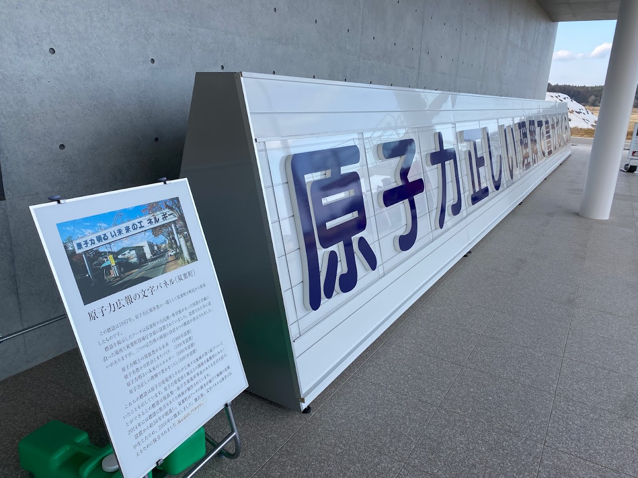 原子力広報の文字パネルのレプリカが伝承館の外に設置されている。「豊かなくらし」「明るい未来」…今となっては全てが皮肉だ。