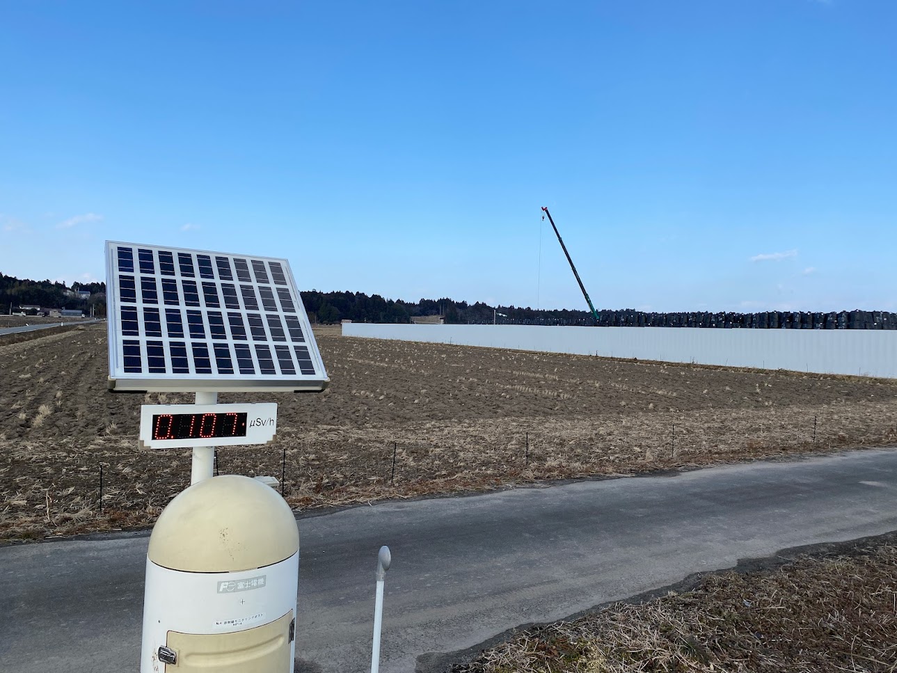 黒いフレコンバックの山、近くには空間線量を測るモニタリングポストがあるが…この光景に違和感を感じなくなることが怖い。