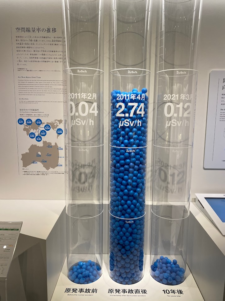 わたしはインタビュー前、会場であるこの伝承館を一人で見学させていただきました。はじめに大きなスクリーンで原子力発電とともに歩んできた歴史や震災当時の様子を見ることができ、2階では原子力災害について多くの展示物が並んでいて、当時の様子や除染について詳しく知ることができました。