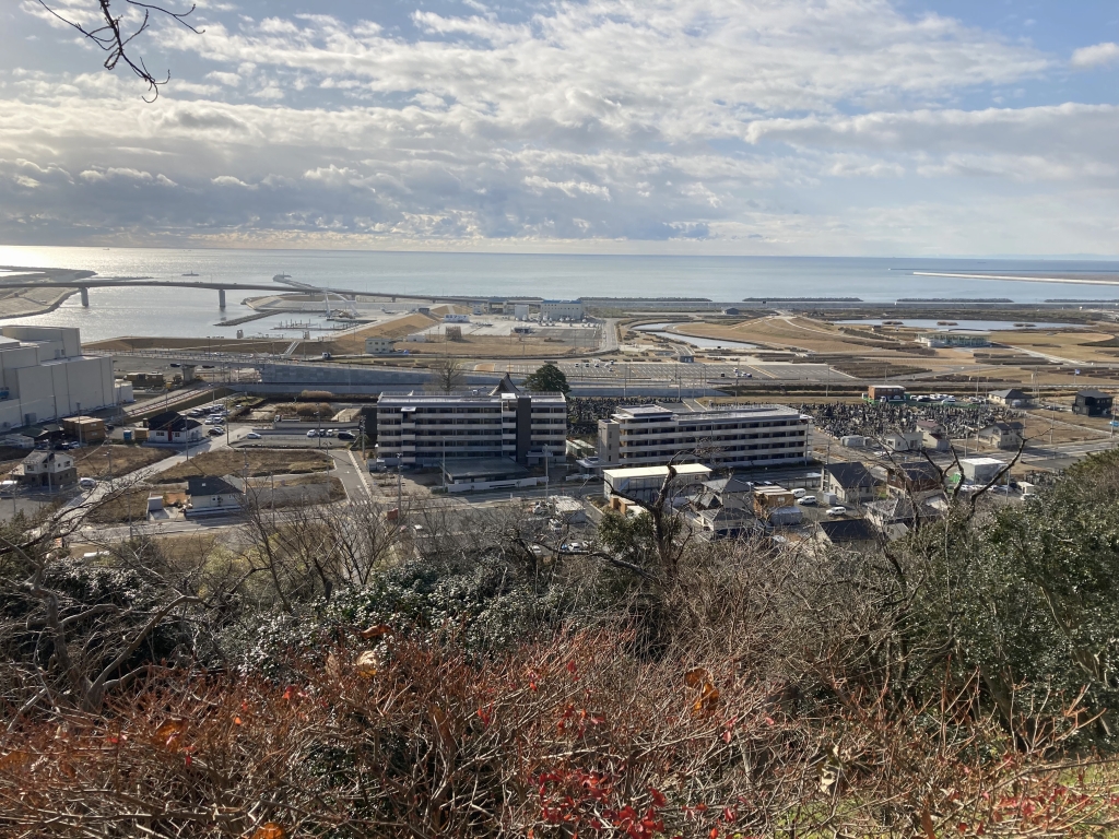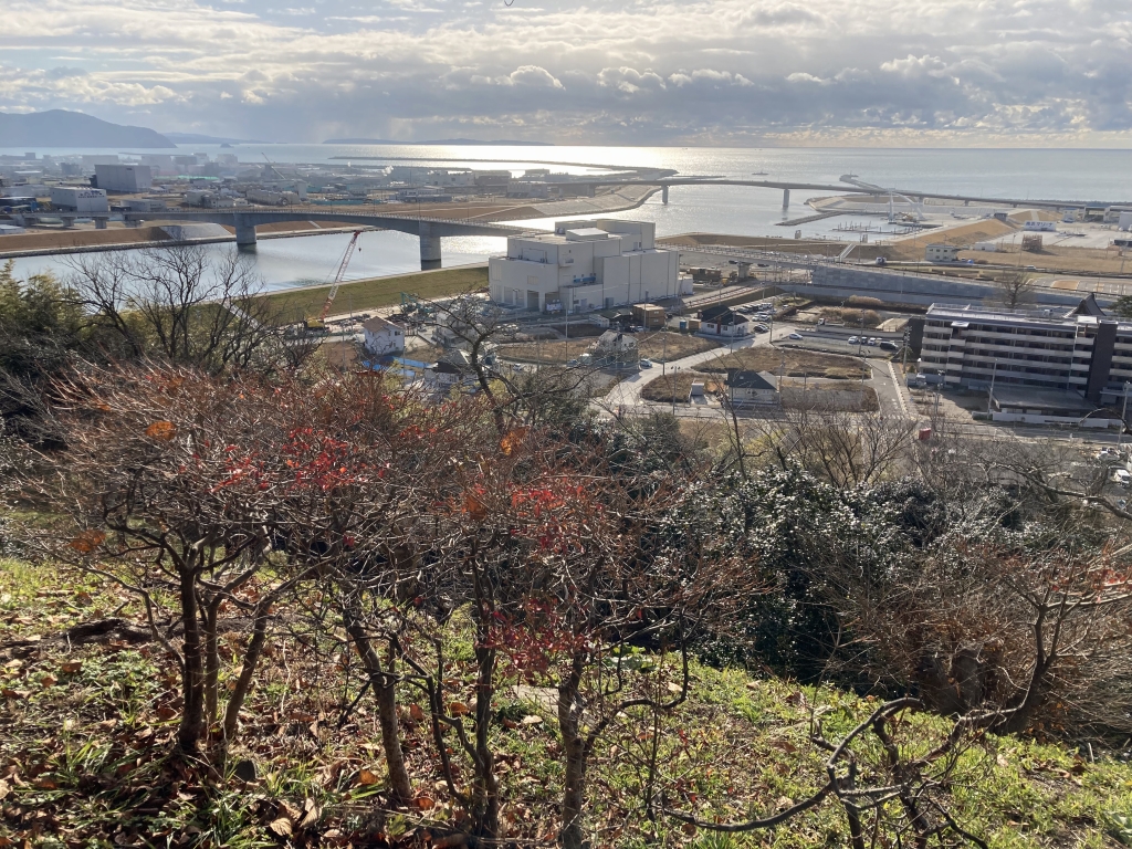 眼下に復興住宅、南浜アリーナ、日和大橋を望む。