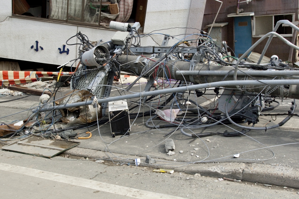 激しい揺れで多くの電柱が傾いてしまった。(写真は震災発生後の古川営業所管内)