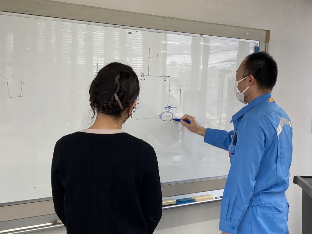 電気はどのようにして家に届くのか。皆川さんの「授業」を受ける宮田さん。