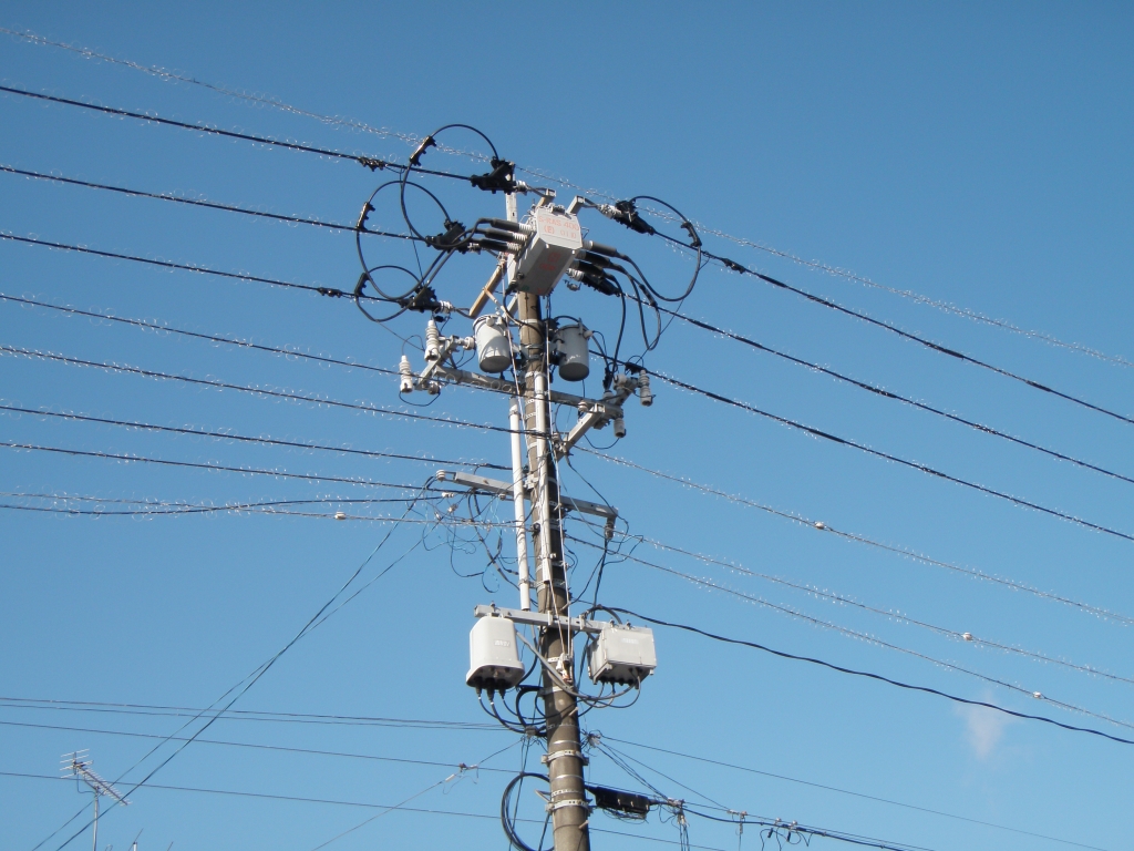 電柱をよく見ると、多数の機材が設置されている。電線には鳥除けのパーツも付けられている。
