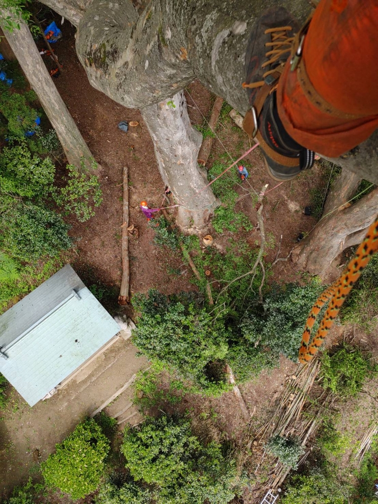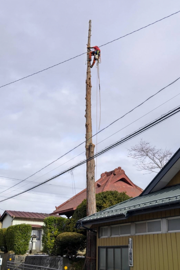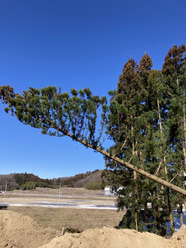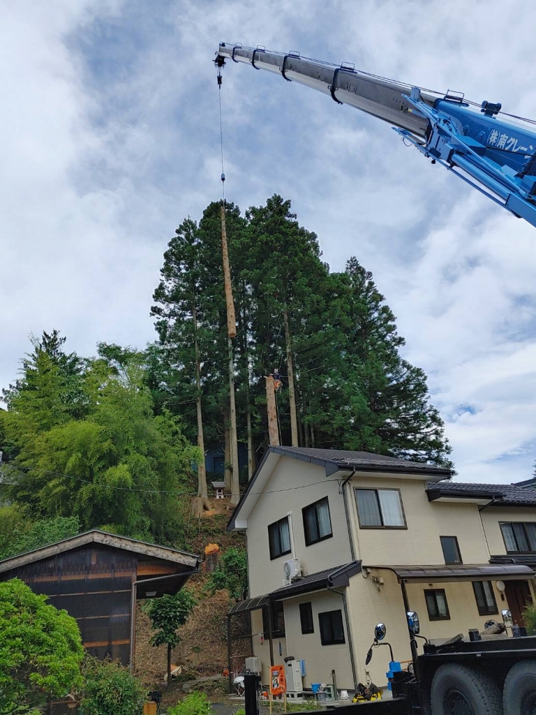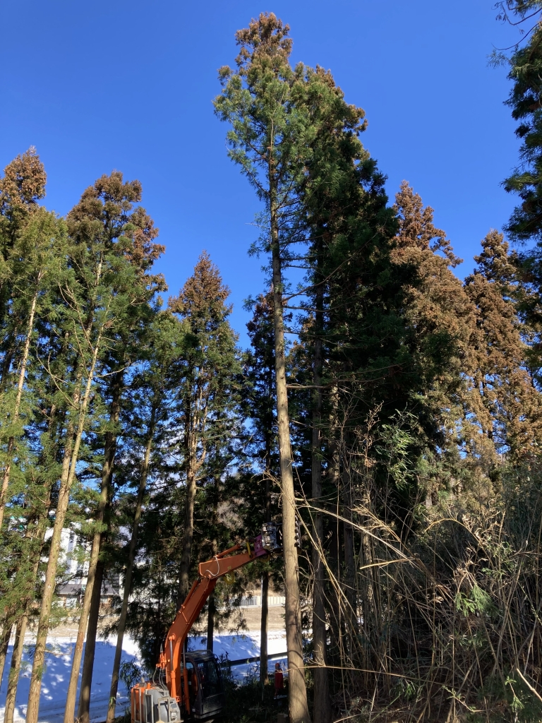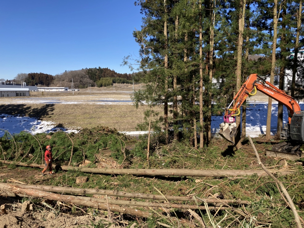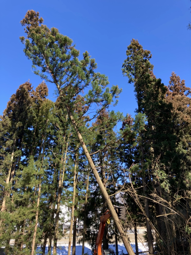 20m以上の高さがある大木を伐採する様子。最初にチェーンソーで根本付近に切り込みを入れた後、重機で安全な方向へ押し倒す。風向き次第では予定していた位置と違う場所へ倒れる可能性もあるので、細心の注意が必要。