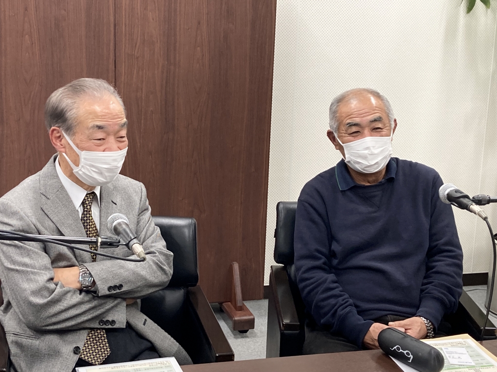 小野寺孝さん(右)は瓦礫処理場の跡地をパークゴルフ場に整備する工事に携わった。当時、工事の予算に関して小泉さんと結構やり合った!?とのこと。