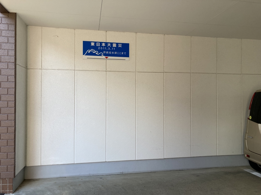 社屋入り口から駐車場へ至る通路。車を越える高さの津波が押し寄せた。