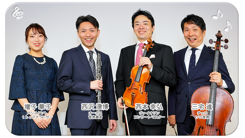 仙台フィルハーモニー管弦楽団の西本幸弘(ヴァイオリン/コンサートマスター)、三宅進(チェロ)、西沢澄博(オーボエ)の3人が月替わりでパーソナリティを務めます。様々な切り口からクラシック音楽の楽しみ方をナビゲート!
