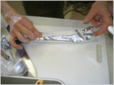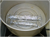 〈りんごのプレザーブを作る〉 1) 全材料を鍋に入れて水分がなくなるまで煮る。(煮終ったら、よく冷ましておく) 〈スチームケーキ生地を作る〉 1) ボウルにバターを入れクリーム状に練り、砂糖も加えよく混ぜる。 2) 1)に卵とバニラオイルも加える。 3) 2)にふるっておいた薄力粉とベーキングパウダー、冷めたりんごのプレザーブを加える。 4) 3)の生地を11cm×25cmにカットしたアルミホイルに包んで強火の蒸し器で10〜15分蒸す。 ![]() ![]() ★ポイント★ ※卵は2〜3回に分けて加える。 ※生地を包むアルミホイルは、折りしろを2重にして、しっかり包むこと。 |