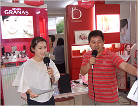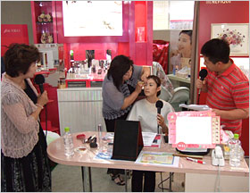 ご説明は岩渕オーナが担当。目元が終わり、リップにはマキアージュを使い「ぷるぷるリップ」の出来上がりです!