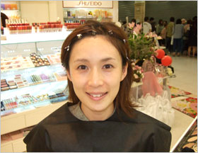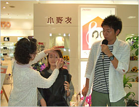 一度、はすみのすっぴんを見ているはずの島田さん、お約束のお約束「どなたですか??」ももう定番(笑)はすみは目元がスッキリしているので、明るくフワッとした感じを作っていきます。目の下のキワに明るい色を入れることにより白目がキレイに見えてくるそうです。