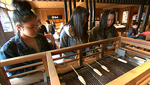こちらではかまぼこの手焼き体験ができます。また、人気商品「むう」の揚げたて、ほかほかを味わうこともできます。