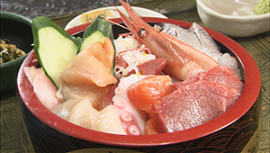 新鮮な海の幸が味わえるお店。おすすめの「海鮮丼」は、丼を覆う新鮮具材の種類が多いこと石巻ならでは、です。