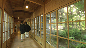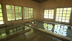新北上川河口側 レトロな雰囲気が漂う建物。ご主人こだわりのお風呂は、樹齢500年のカヤの木の湯船です。