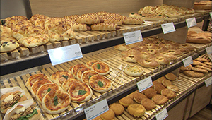 店内には80種類ものパンがずらり。通勤途中に、おでかけ帰りのおみやげに…。種類が多すぎて迷ってしまいそうです。