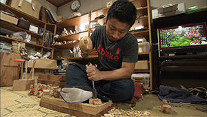 奈良県の伝統工芸“奈良一刀彫り”で作品を製作販売しているのは石橋泰宏さん。陶芸家として活躍している奥様の実家のある蔵王に移住し、工房をひらきました。