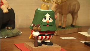 ノミと木づちで木を削り、形を作り上げていきます。一刀一刀、ノミの跡が残るのが特徴。干支や蔵王のご当地キャラざおうさまなど、かわいらしい作品もたくさんあります。工房隣のギャラリーで、奥様の陶芸作品とともに展示・販売されています。