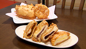 具は、あんこ・カレー・チョコ・クリーム。パンをまるごと天ぷらの衣にくぐして揚げています。形も丸や四角と楽しいパンです。