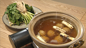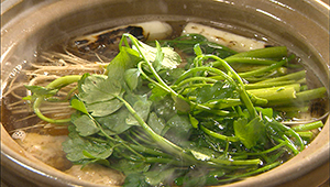 仙台のお鍋の定番となった「せり鍋」。名取市でとれたセリのおいしさはもちろん、アゴとカツオの出汁に具材で三陸産ワカメを入れることで深みを増したスープも絶品です。