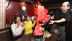 このあとが見せ場!フタを取った瞬間に火。アルコールを飛ばすための調理工程ですが、火のあがる鍋を目の前で見られるのは、興奮ものです。ここから具材を入れて、旨味たっぷりを召し上がれ。