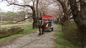 「サクラの名所100選」にも選ばれている花見スポット。約1万本の桜の並木が美しい敷地内では、さくらまつりのシーズンは馬車に乗ることもできます。