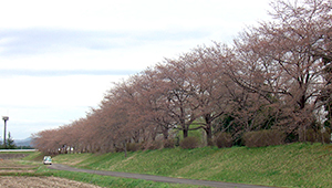 北上市の南部を流れている和賀川。この堤防沿いは、地元の人たちのおすすめ桜スポットです。約6キロ、600本の桜の並木が続いているんです。ソメイヨシノの見頃が過ぎると、ピンク色の濃いオモイガワザクラがGWにかけて見頃に。