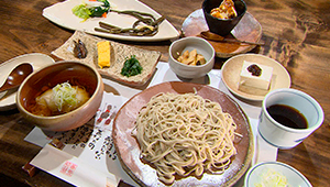 メニューはそばのコース料理。今回取材でいただいた「花の山のコース」は、コシがあり香りもうまい打ち立ての蕎麦に、そばだんごやデザートまでついたおすすめのセットですよ。特製“そばシフォンケーキ”はご予約の際に注文してください、とのこと。