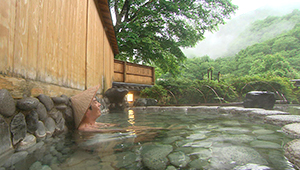 開湯が平安時代末期とも伝わる古くからの温泉宿。内風呂、露天ともに充実のお湯は、低張性アルカリ性高温泉。山の緑が美しいこの時期は厳選かけ流しの露天風呂がおすすめです。