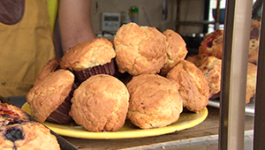 オーナーの木口さんが手作りしているマフィンは15種類。バター、フランスの黒塩、チョコレートなど、ひとつひとつの素材にこだわり、中でも小麦粉は無漂白、石臼でひいて香りや食感も楽しめる生地に仕上げています。身体にやさしい素材で“食べた時に笑顔になる”エッセンスを加えて作っています、と話してくれました。