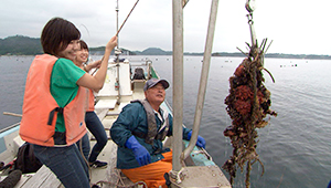 1年を通して、養殖が盛んな大島。いまの時季は「ホヤ」が旬、船に乗せてもらい、水揚げを体験したり、とれたてを味見したり、普段なかなか体験できない楽しさですよ。