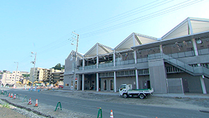 気仙沼市内は、震災後につくられた仮設復興市場の「紫市場」がこの4月に閉鎖され、すぐ近くに常設の「紫神社前商店街」を建設中。8月下旬のOPENに向けて準備が進められています。