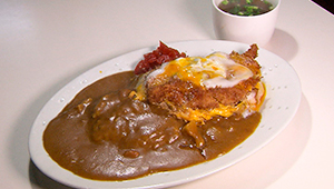 カツ丼風カツカレーが人気のお店。40年ほど前から出しているメニューです。ラーメンスープをベースに煮込んだカレーと、やわらかいカツを玉子でとじたものが、ど~んとごはんの上にのっています。それぞれを食べるもよし、混ぜながら食べるもよし。夢のボリュームメニューです。辛さの調節もしてくれるそうですよ。