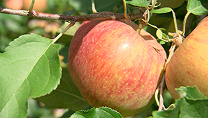 おいしいりんごを見分けるポイントは、実の下側の色です。青くなく、黄色っぽくなり赤みがさしているのが食べごろのサインだそう。